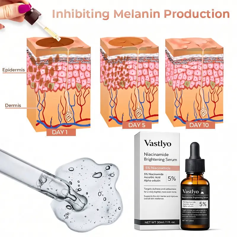 4. Niacinamide – Niacinamide can inhibit the transfer of melanin from melanocytes to keratinocytes, thereby reducing surface pigmentation. It also has anti-inflammatory properties, helping to reduce skin inflammation and redness, while enhancing the skin’s barrier function to maintain healthy and hydrated skin