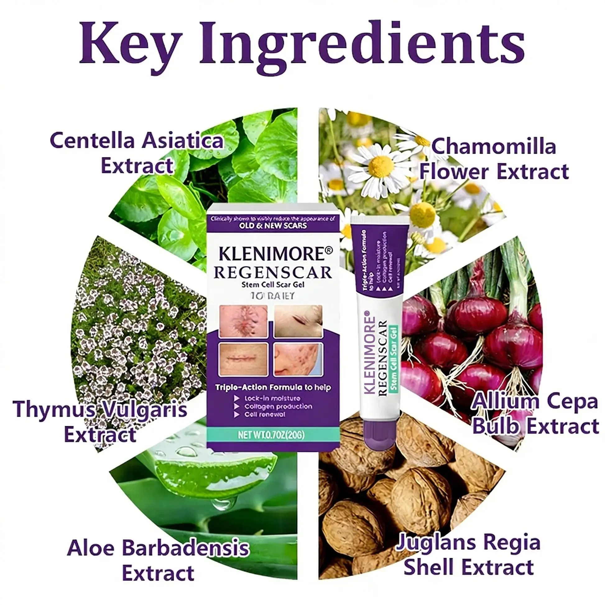 KLENIMORE® ReGenScar Stem Cell Scar Gel, developed in collaboration with board-certified U.S. dermatologists. It delivers professional-grade skincare with every application. Its advanced formula is designed to significantly reduce the appearance of both new and old scars, including surgical scars, stretch marks, keloids, acne scars, burns, warts, skin tags, and varicose veins.